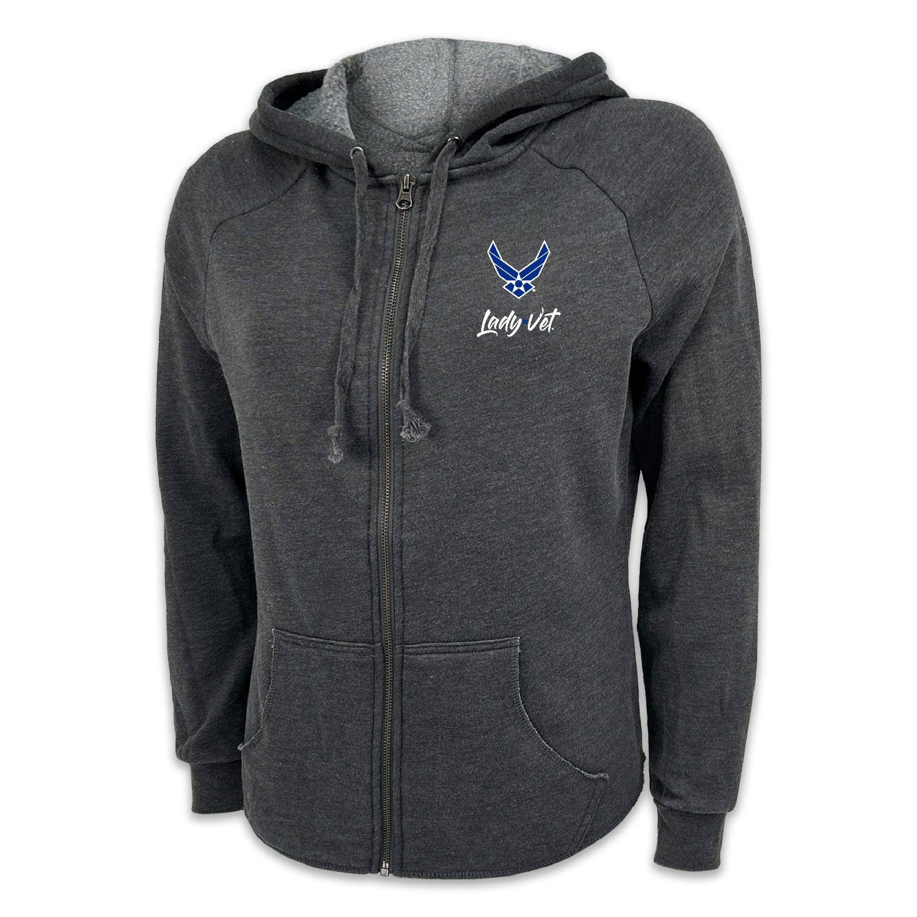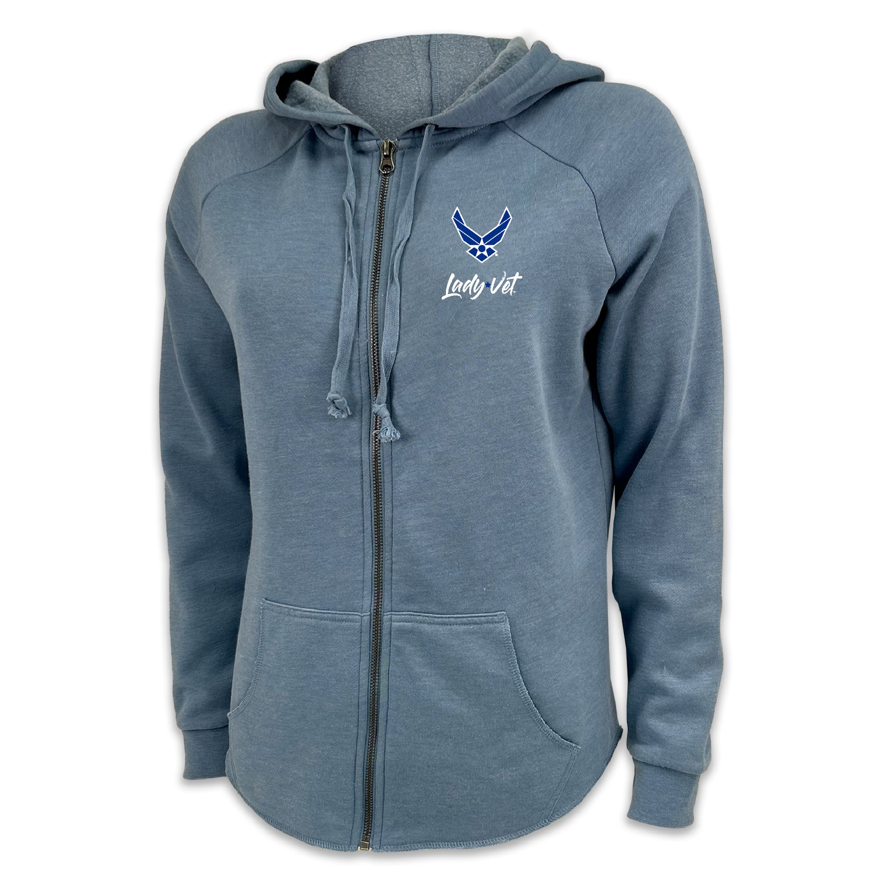 Stay warm and stylish with our Air Force Lady Vet Ladies Full Zip Hood! Made from a soft cotton blend fleece, this classic-fit hoodie features raglan sleeves and an antique nickel zipper—perfect for showing your Air Force pride in comfort.