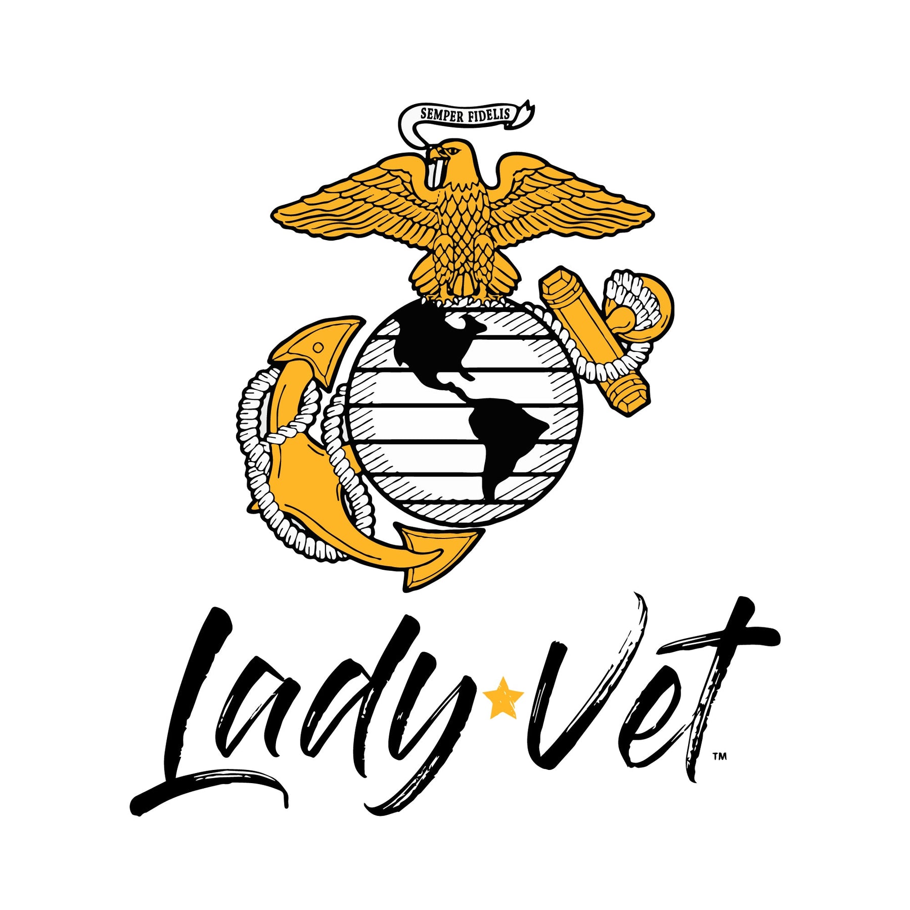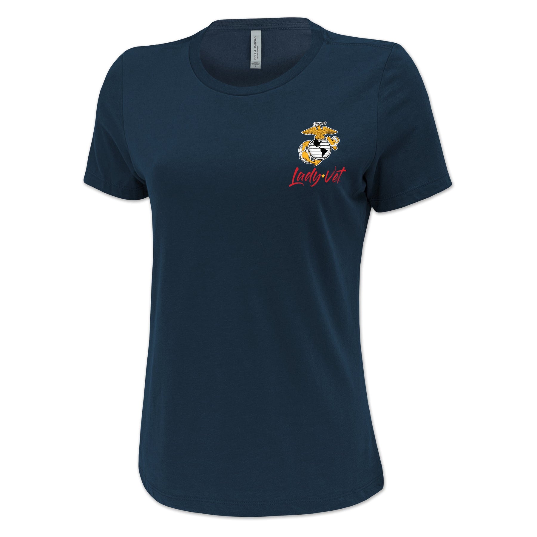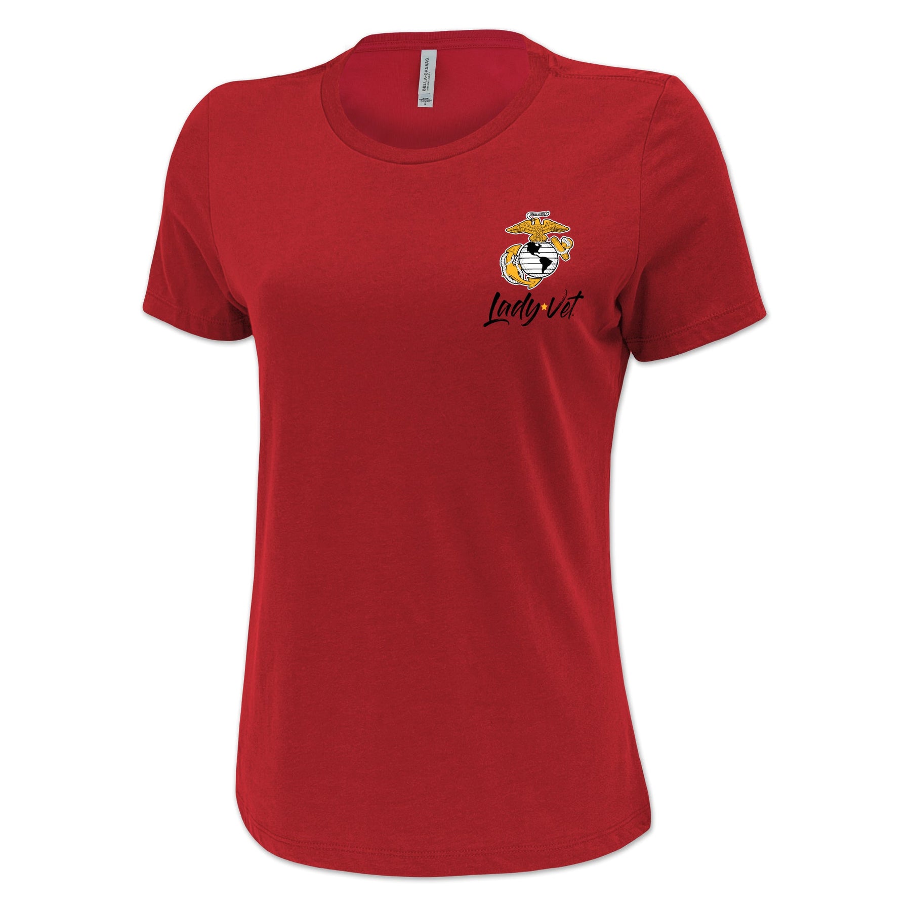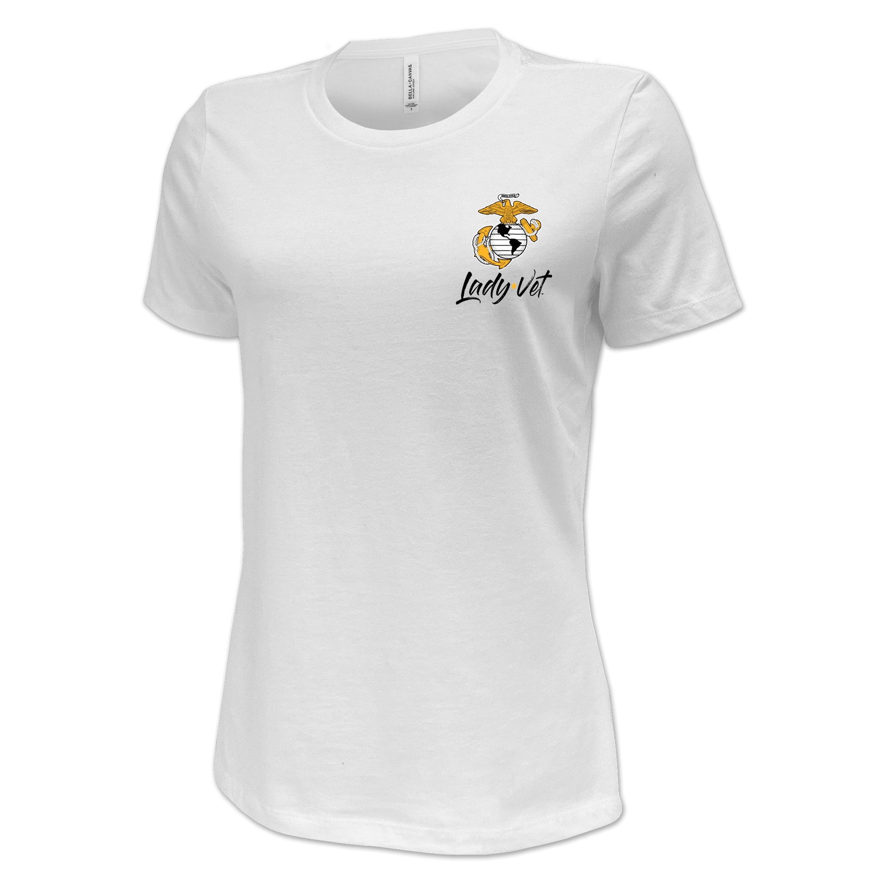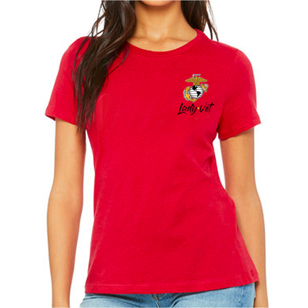 Lady Vet is a woman-owned, Veteran-owned brand created specifically to challenge public assumption of what a Veteran looks like. Show your support or wear it proudly; the Marines Lady Vet Left Chest Logo Ladies T-Shirt!