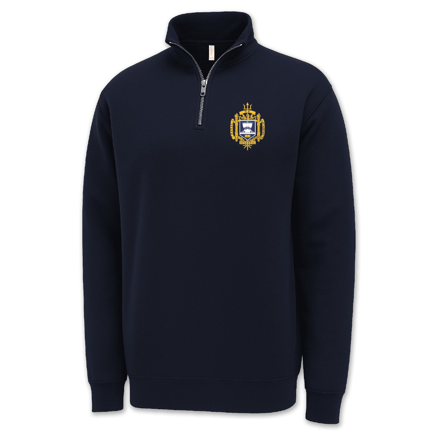 Show your Academy pride with the USNA Crest 1/4 Zip, featuring the iconic United States Naval Academy crest. This stylish and comfortable piece is perfect for showcasing your connection to the Academy and its storied traditions!