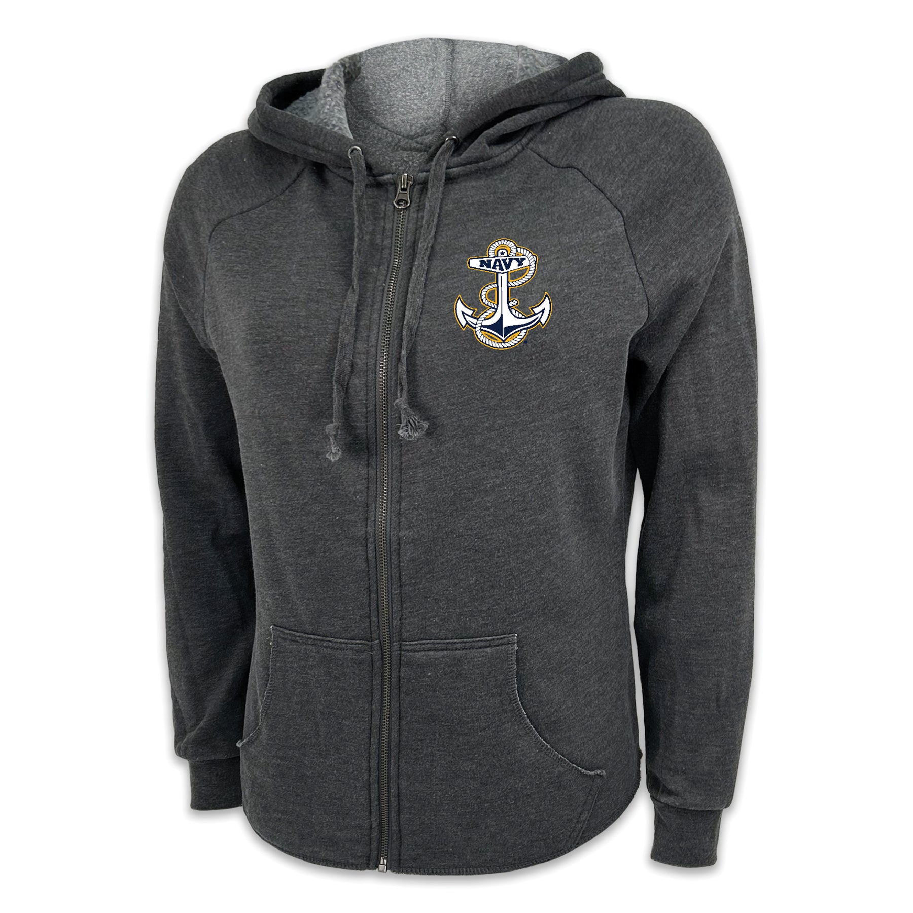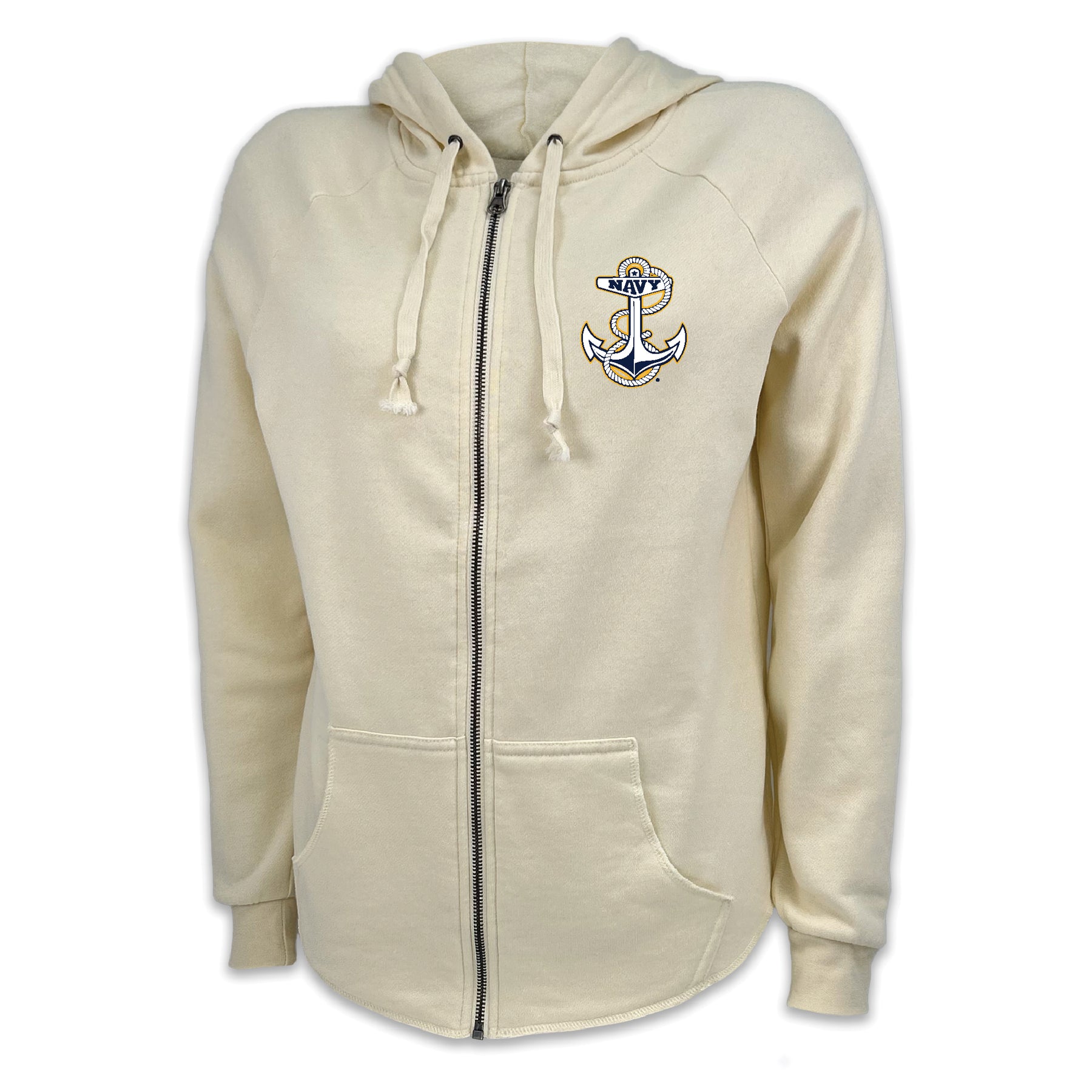 Stay warm and stylish with our Navy Anchor Ladies Full Zip Hood! Made from a soft cotton blend fleece, this classic-fit hoodie features raglan sleeves and an antique nickel zipper—perfect for showing your Navy pride in comfort.