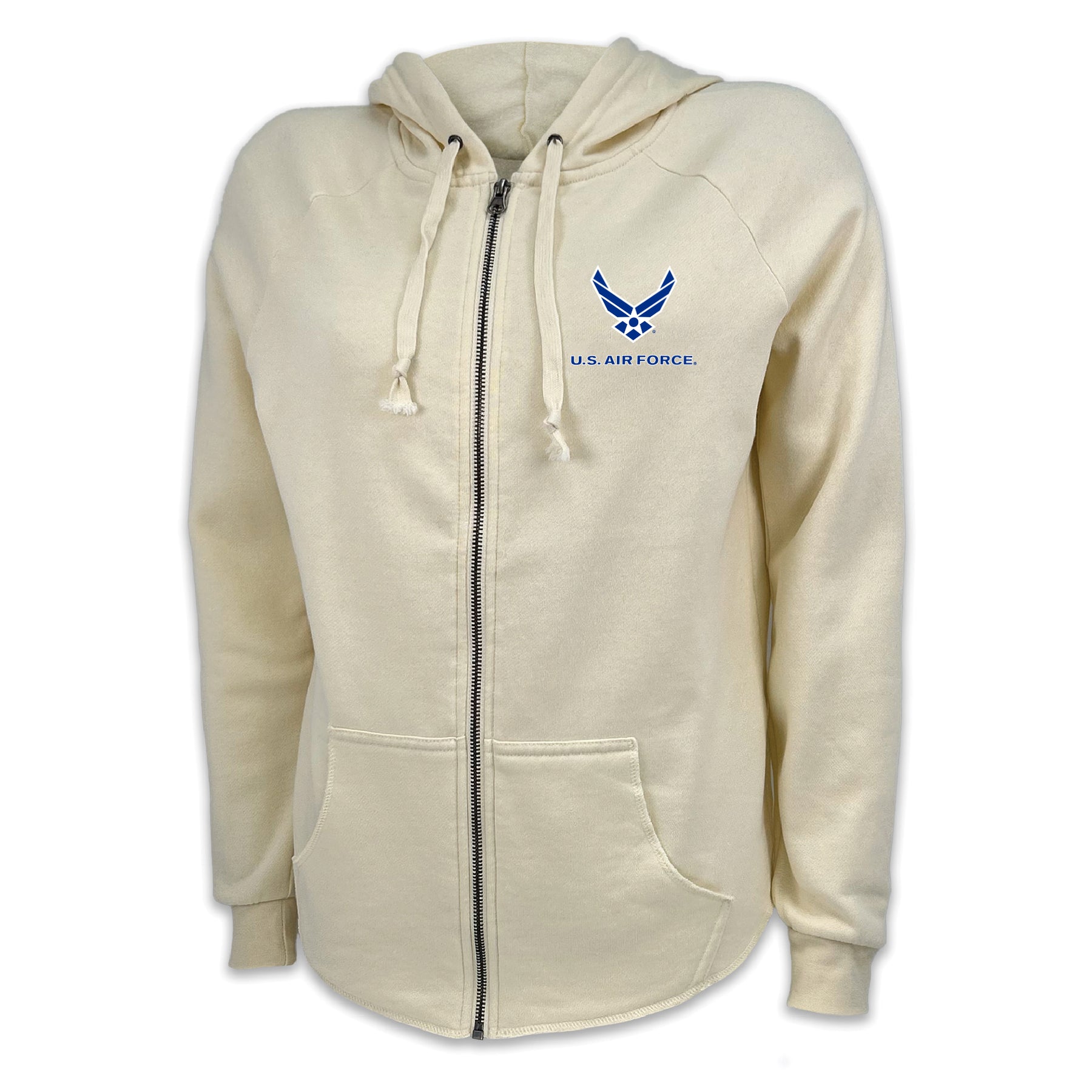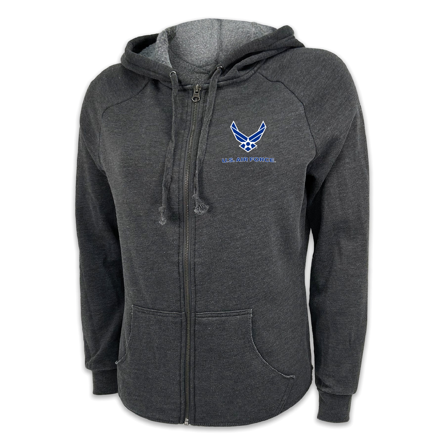 Stay warm and stylish with our Air Force Wings Ladies Full Zip Hood! Made from a soft cotton blend fleece, this classic-fit hoodie features raglan sleeves and an antique nickel zipper—perfect for showing your Air Force pride in comfort.