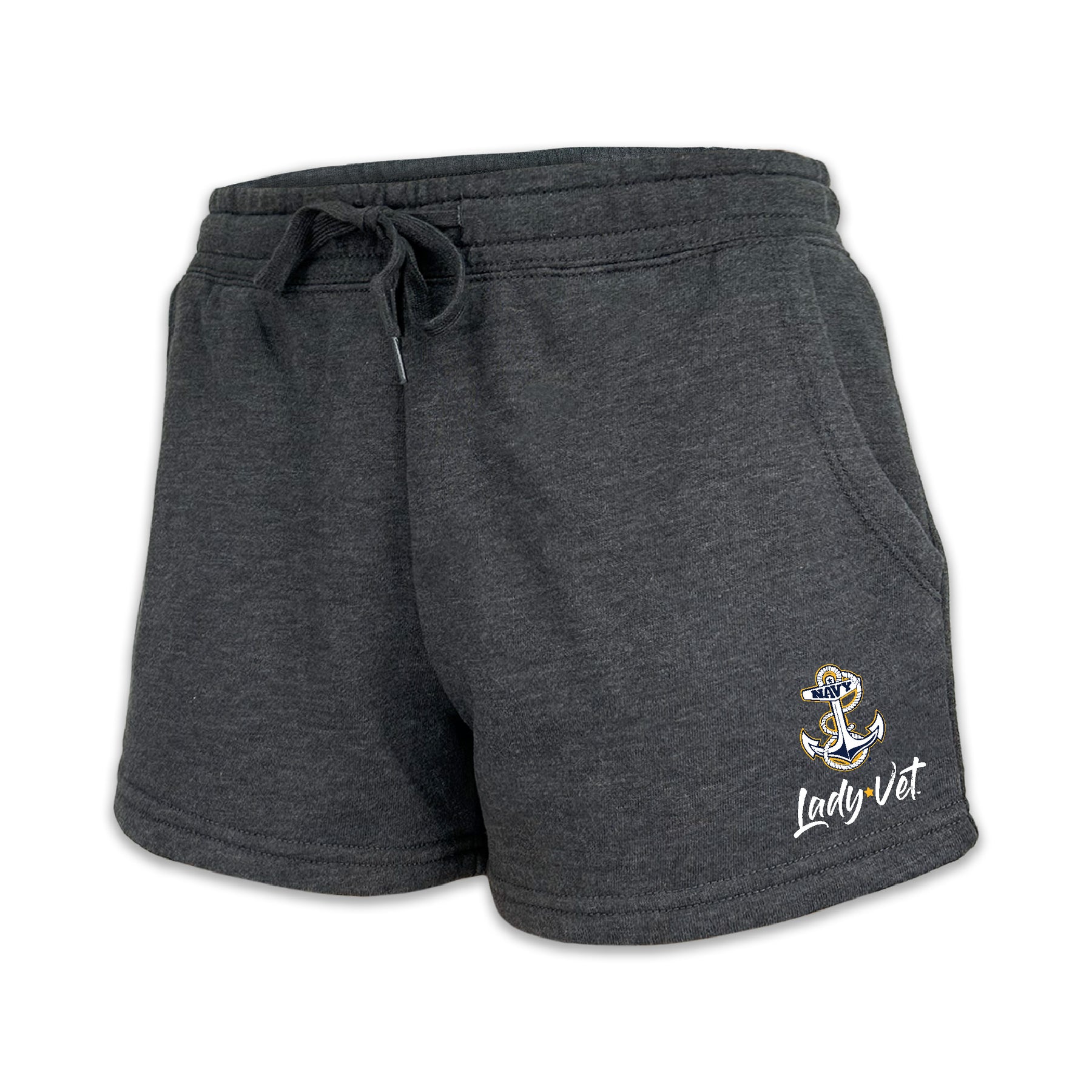Embrace comfort and style with our Navy Lady Vet Ladies Fleece Shorts! Made with a soft cotton blend fleece, these classic-fit shorts feature an elastic waistband with drawcord and jersey-lined pockets, perfect for casual wear and showing your Navy pride!