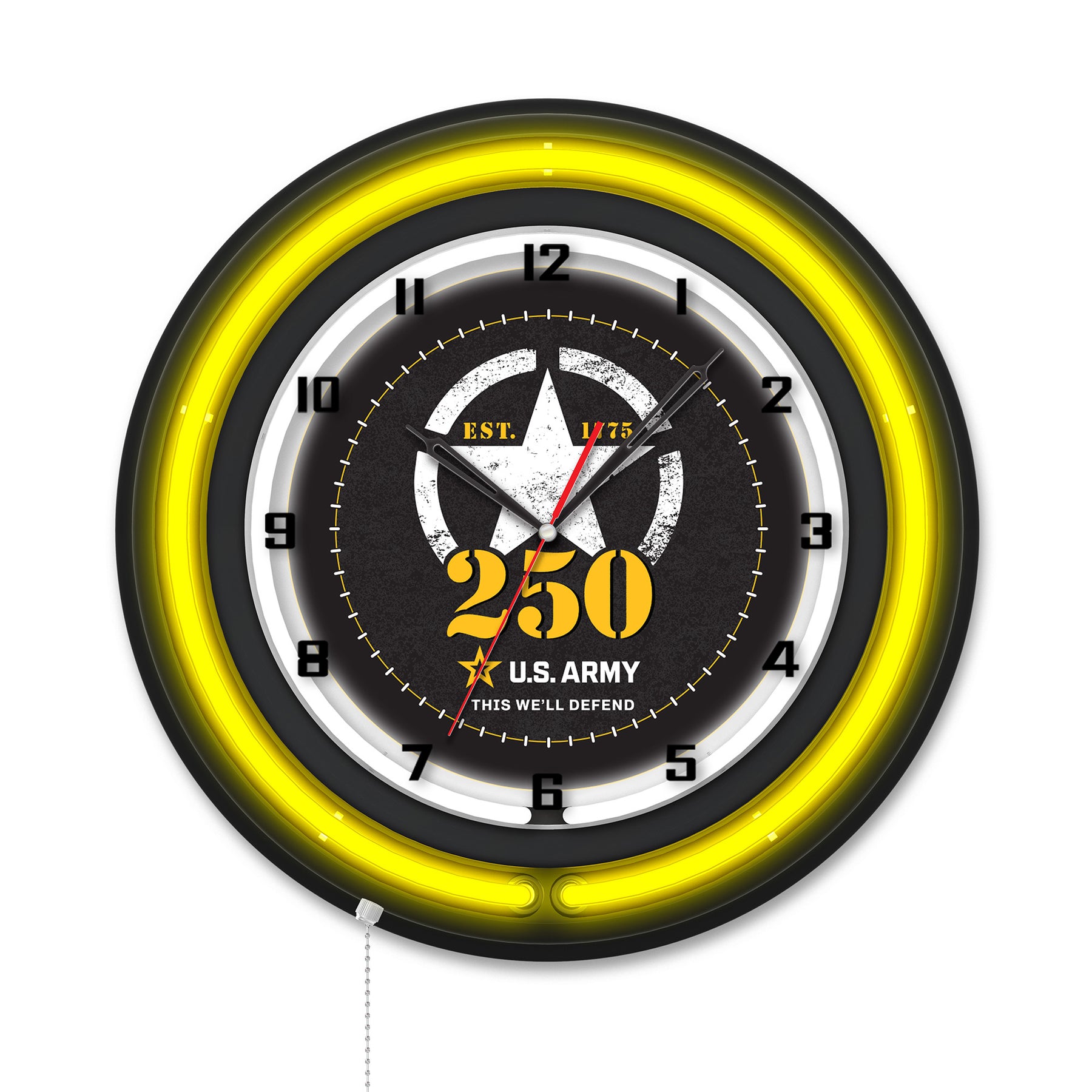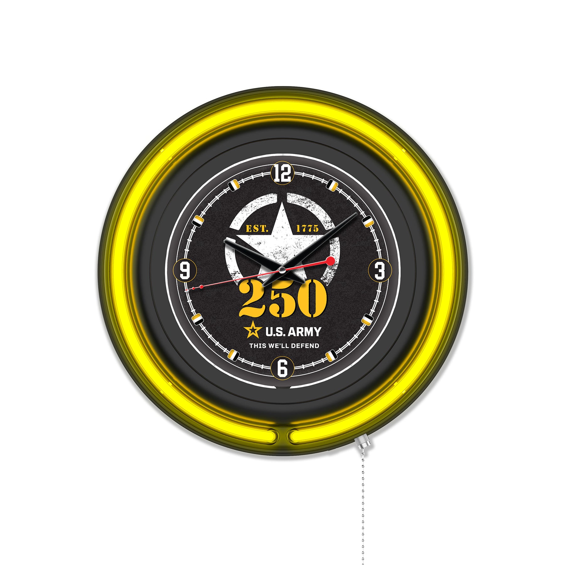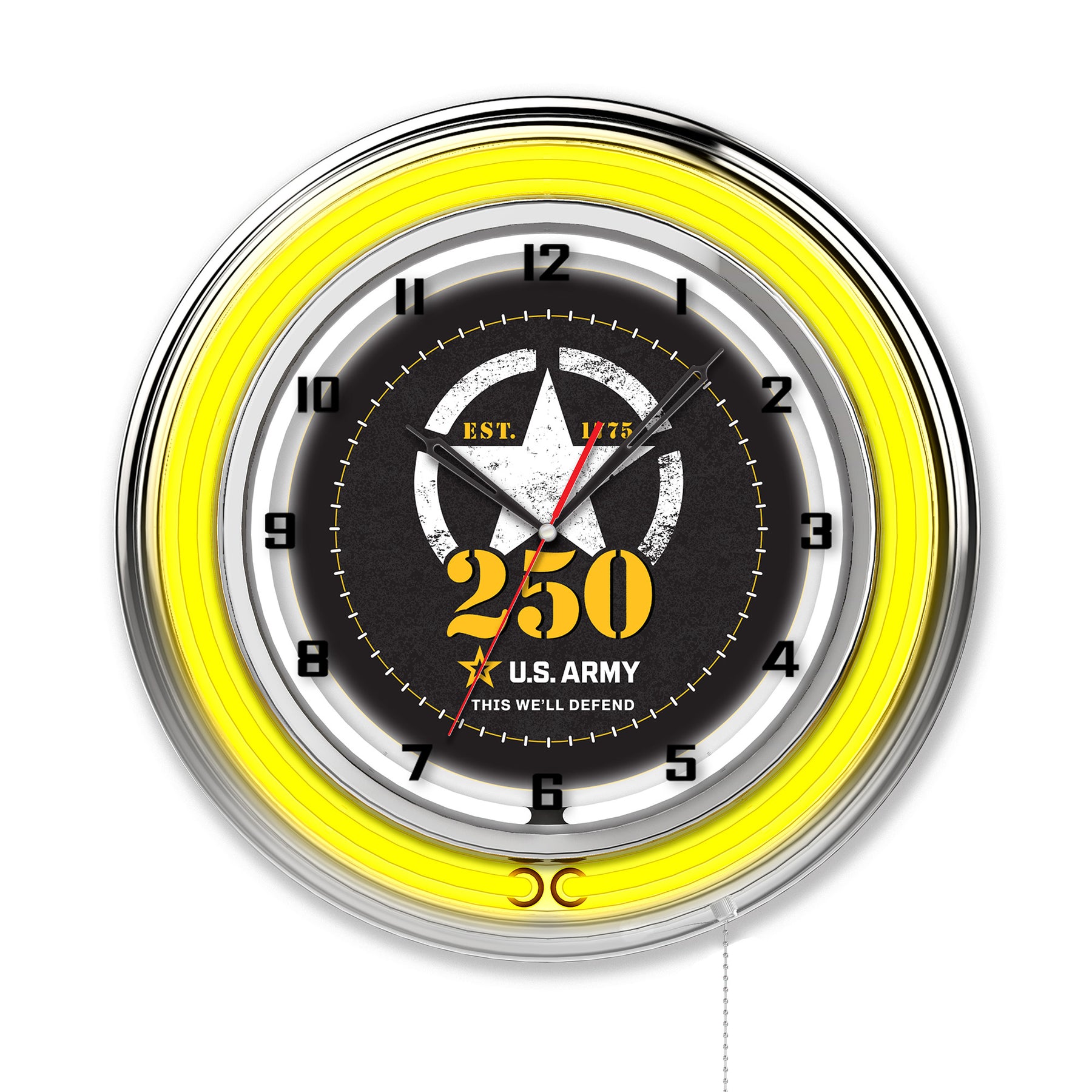 The United States Army 250th Anniversary Double Neon Wall Clock is the perfect way to show your support for our troops. Featuring a chrome casing and a color specific neon outer ring that accents the custom printed clock face which is lit up by an brilliant white, inner neon ring. The Neon rings are easily turned on and off with a pull chain on the bottom of the clock, and are powered by a UL Listed power transformer that runs off standard 120V outlet. Accurate quartz movement ensures proper time and is powered by a single, AA battery (not included). Add a bold and vibrant touch to your décor while proudly displaying your support for the United States Army!