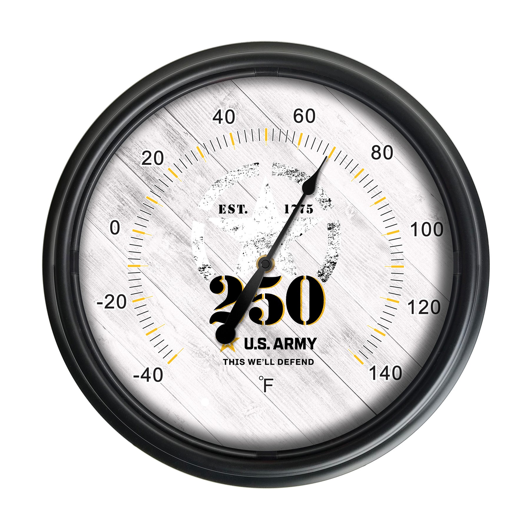 The dynamic United States Army 250th Anniversary Indoor/Outdoor LED Thermometer showcases vibrant, full-color UV printed artwork that is both eye-catching and durable. Factory calibrated to provide precise temperature readings from -40 degrees Fahrenheit to 140 degrees Fahrenheit, it's a reliable weather gauge for any setting. Show your pride in the United States Army with this functional and decorative thermometer!