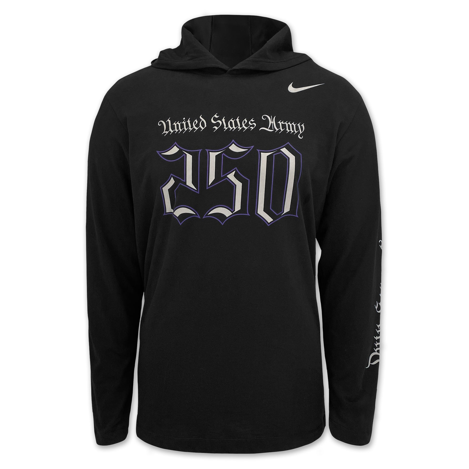 Honor 250 years of Army strength and tradition with the United States Army Nike 2025 Rivalry 250 Cotton Long Sleeve Hoodie Tee. Part of the exclusive Rivalry Collection, this lightweight layer blends soft cotton comfort with bold graphics that celebrate Army pride and the historic showdown against Navy. Finished with a casual hood for a modern edge, it’s perfect for game day and beyond.